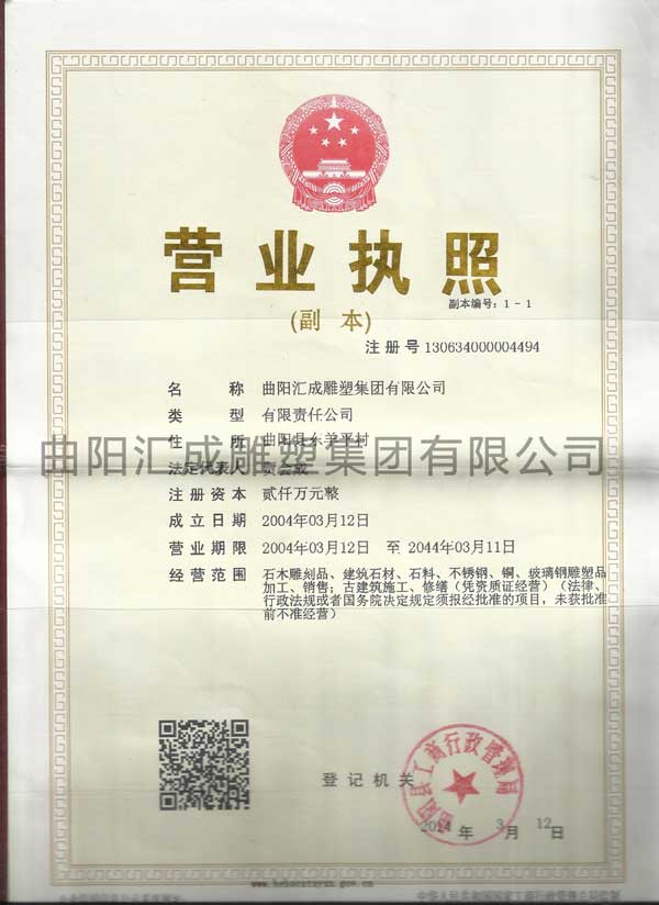 公司建于1986年坐落于中國雕刻之鄉,河北省曲陽縣,占地80畝,雕刻大師、技師等員工300名,生產加工、園林、仿古、建筑、石木雕刻、銅雕、不銹鋼、玻璃鋼雕塑等,董事長賈會成,“城市雕塑創作設計師”;中國“石雕藝術大師”;省工藝美術師;中國國家人才網國際注冊工藝美術師;河北省雕塑行業協會副會長,河北省工藝美術協會副秘書長,現代教育理論與實踐論壇評委會專家委員,中國民主促進會會員,并多次赴國外進行學術交流,第十屆河北省人大代表。